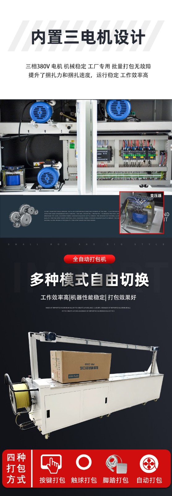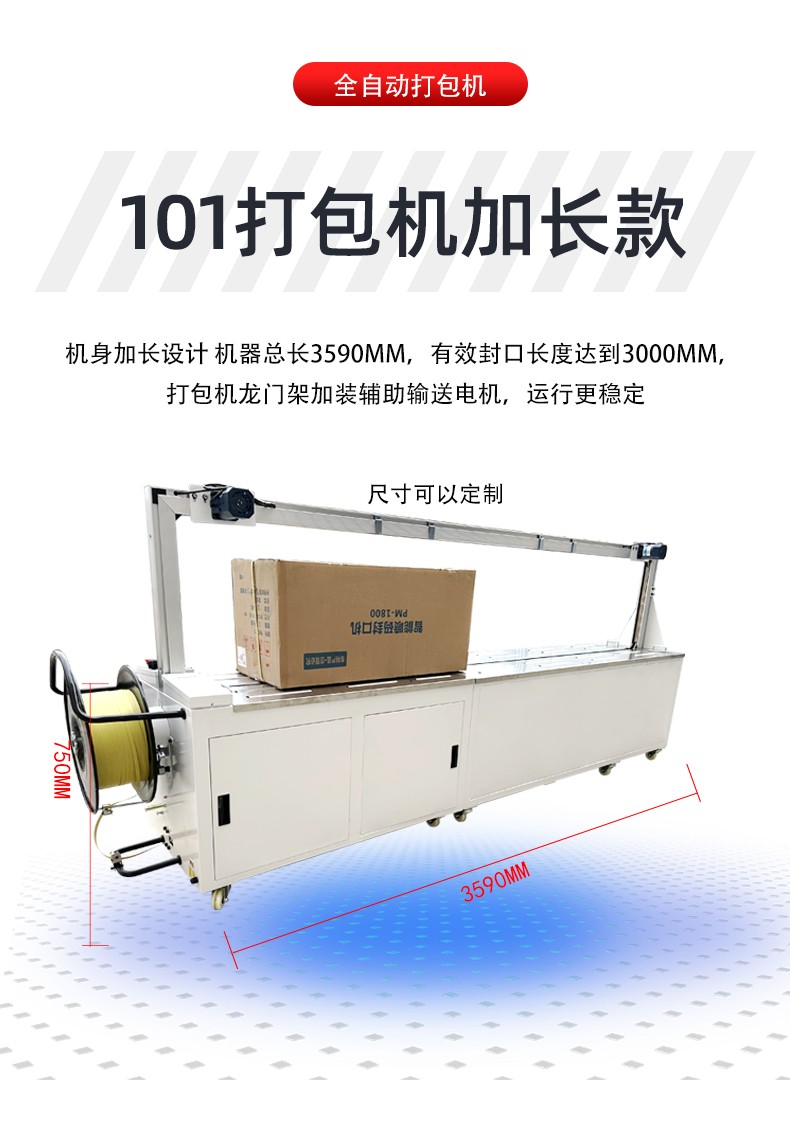 自動打包機的運作基于一套連貫且智能的程序。當物品被放置在傳送帶上并輸送至打包位置時,設(shè)備的傳感器迅速捕捉到物品的存在與位置信息。打包帶隨即從帶盤自動送出,通過送帶機構(gòu)精準地環(huán)繞物品一周。此時,加熱裝置啟動,將打包帶的接頭部位加熱至熔融狀態(tài),緊接著壓緊機構(gòu)迅速動作,使接頭處牢固粘合,完成一次打包操作。整個過程一氣呵成,無需人工過多干預,極大提升打包效率。
