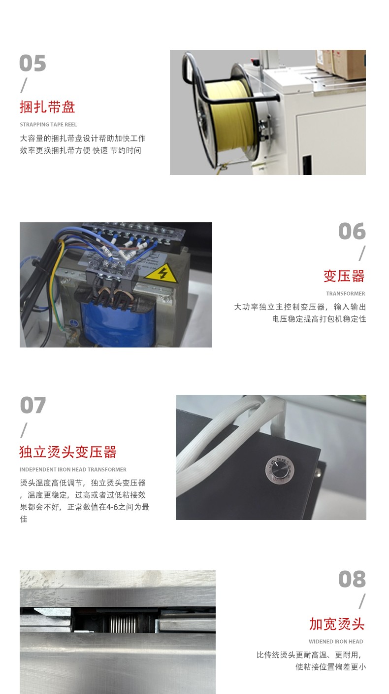 4. 廣泛適用性:可適應各種形狀、尺寸的物品打包,無論是規(guī)則的長方體、正方體,還是形狀不規(guī)則的物品,都能進行有效打包。同時,能兼容多種材質(zhì)的打包帶,如塑料打包帶、塑鋼打包帶等,滿足不同行業(yè)、不同產(chǎn)品的包裝需求。
