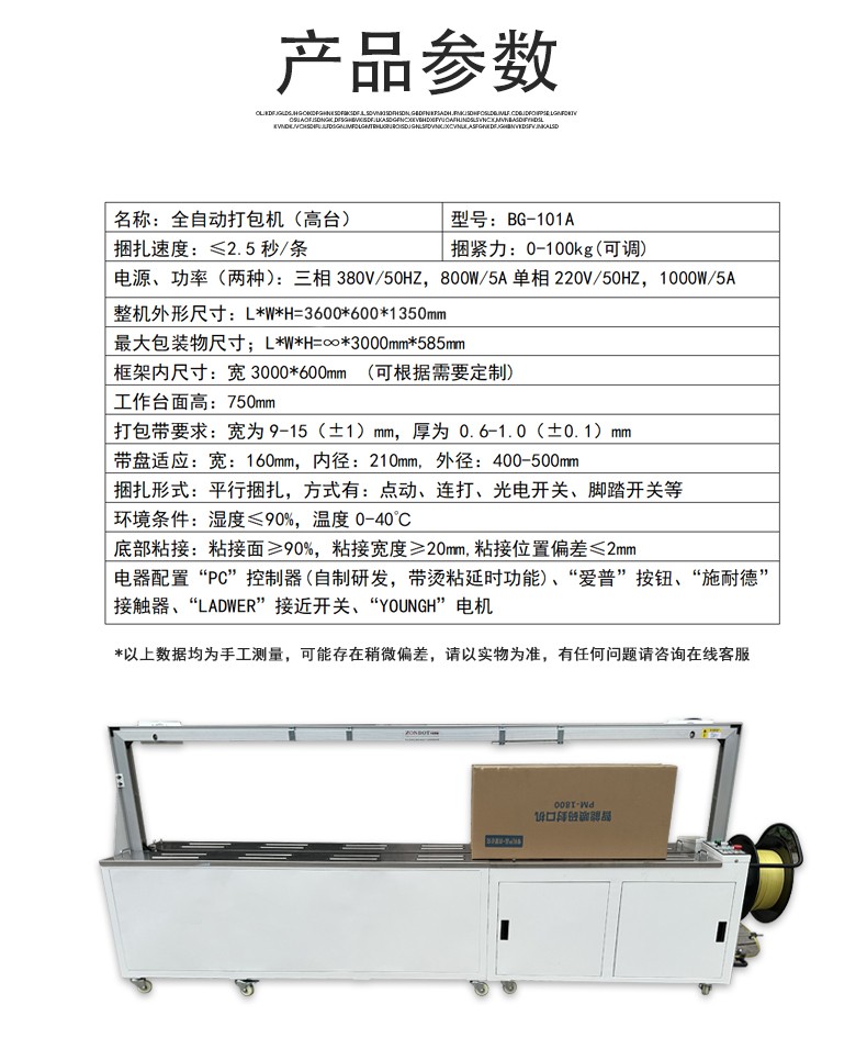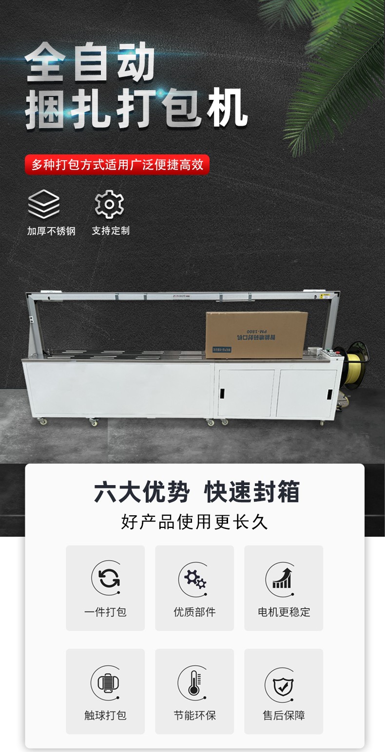 - 高效快速:全自動打包機的打包速度堪稱行業(yè)翹楚,部分高性能機型每分鐘可輕松完成 15 - 25 次打包操作 。以物流倉儲行業(yè)為例,在大型物流中心,每天有成千上萬件包裹需要打包處理。傳統(tǒng)人工打包方式不僅效率低下,還容易因疲勞導致打包質(zhì)量參差不齊。而全自動打包機投入使用后,包裹在傳送帶上源源不斷地被輸送至打包區(qū)域,設(shè)備以極高的速度自動完成送帶、環(huán)繞、加熱封口等一系列動作。每小時能處理數(shù)百件包裹,使得物流中心的包裹打包效率大幅提升,有效緩解了貨物積壓問題,加快了貨物的流轉(zhuǎn)速度 。
