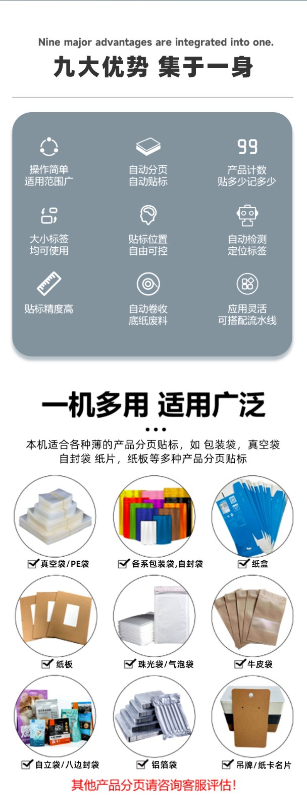 東莞鼎業(yè)機械有限公司的貼標機:自動分頁智能易編機,針對預(yù)制袋、未成形前紙盒、卡片等片狀物料進行分頁、打碼,可打印條碼、可變數(shù)據(jù)、日期、時間、批號、圖案、流水號等。
