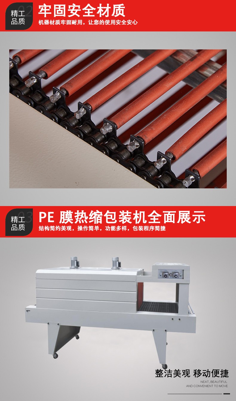 - 例如,當(dāng)把一個(gè)產(chǎn)品用 PE 薄膜包裹好,放入 PE 熱收縮機(jī)中,機(jī)器啟動(dòng)后,薄膜在熱的作用下,就像被賦予了 “生命力” 一樣,逐漸收縮,最后緊貼在產(chǎn)品的輪廓上,就像給產(chǎn)品穿上了一層定制的保護(hù) “外衣”。