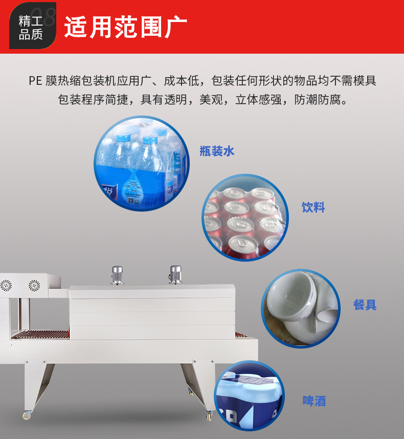 - PE 薄膜本身具有良好的柔韌性,再加上 PE 熱收縮機(jī)可以通過調(diào)節(jié)輸送速度、加熱溫度等參數(shù),使得它能夠?qū)Ω鞣N形狀(如圓形、方形、不規(guī)則形狀)和尺寸的產(chǎn)品進(jìn)行包裝。例如,無論是包裝小型的文具,還是大型的工業(yè)零部件,PE 熱收縮機(jī)都能發(fā)揮作用。