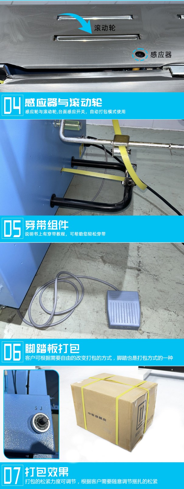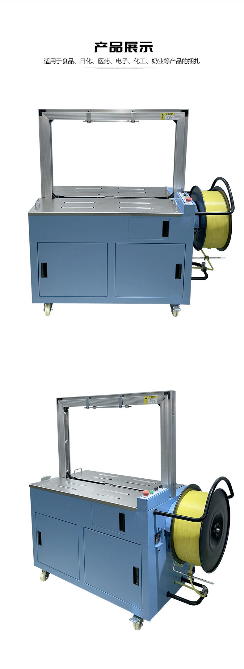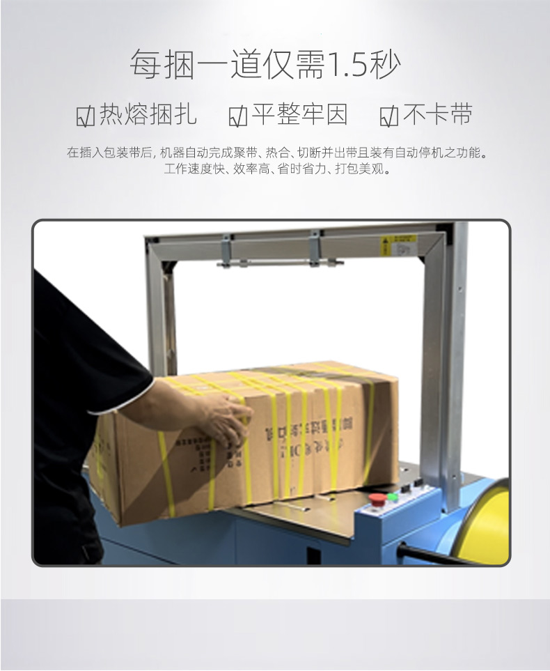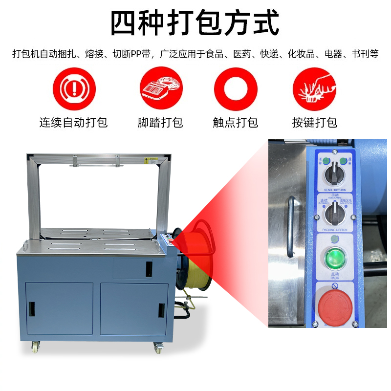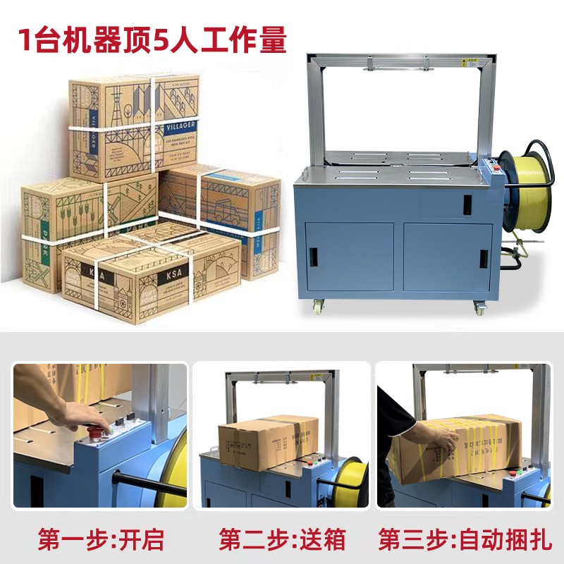 - 自動(dòng)上帶:機(jī)器啟動(dòng)后,會(huì)自動(dòng)從打包帶卷中抽出打包帶,并將其傳送到預(yù)定的位置,準(zhǔn)備進(jìn)行打包。這個(gè)過(guò)程無(wú)需人工干預(yù),大大提高了工作效率。