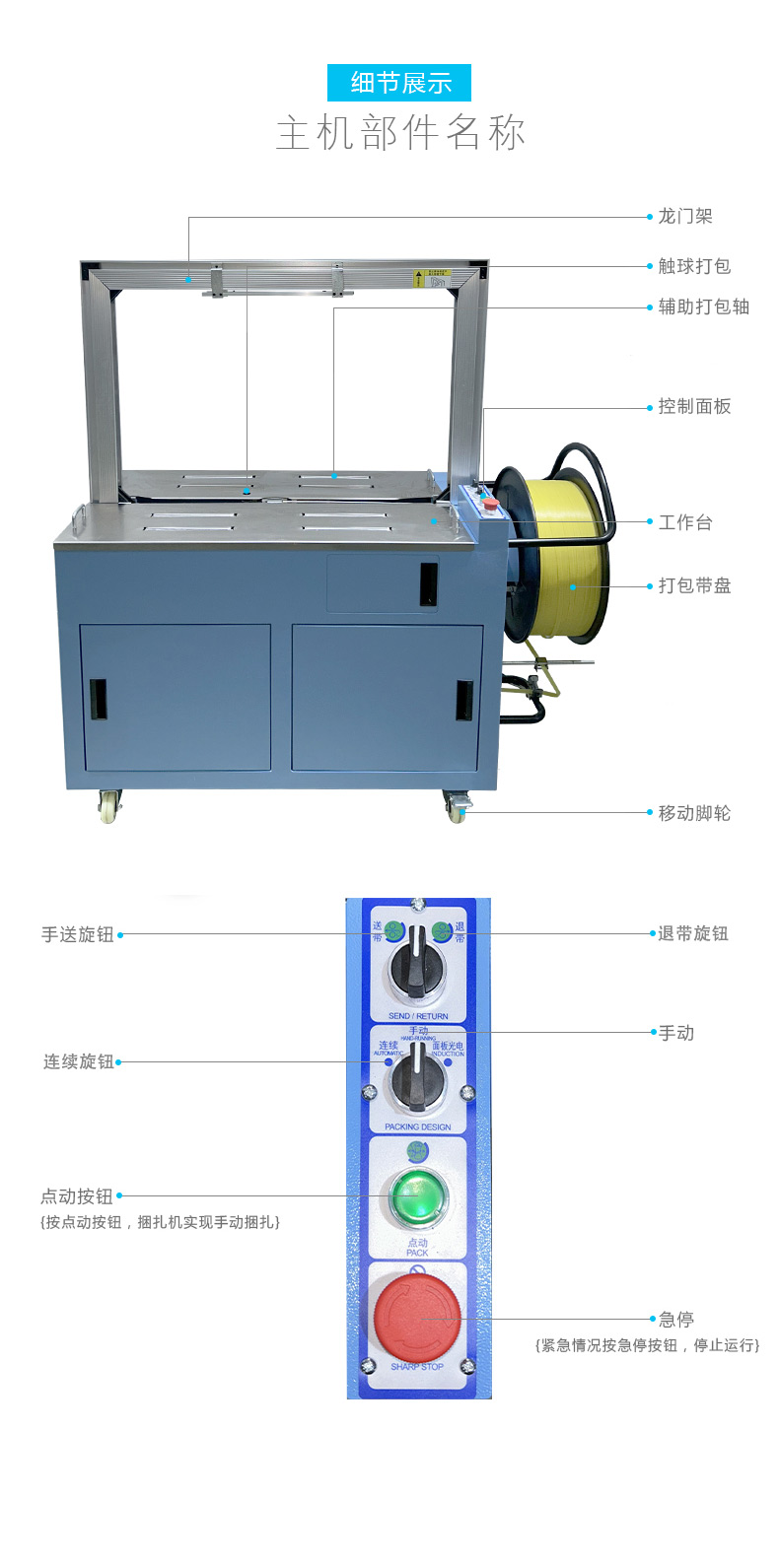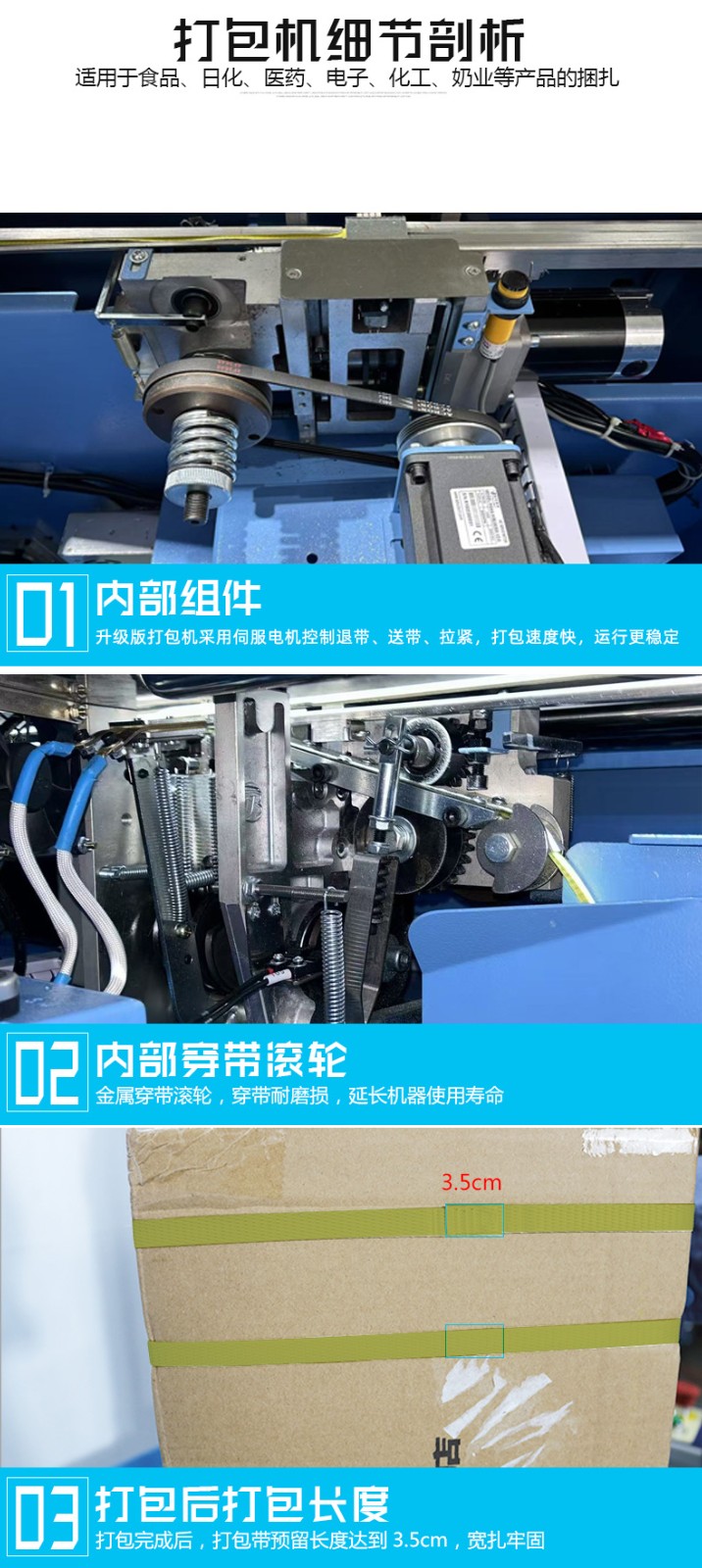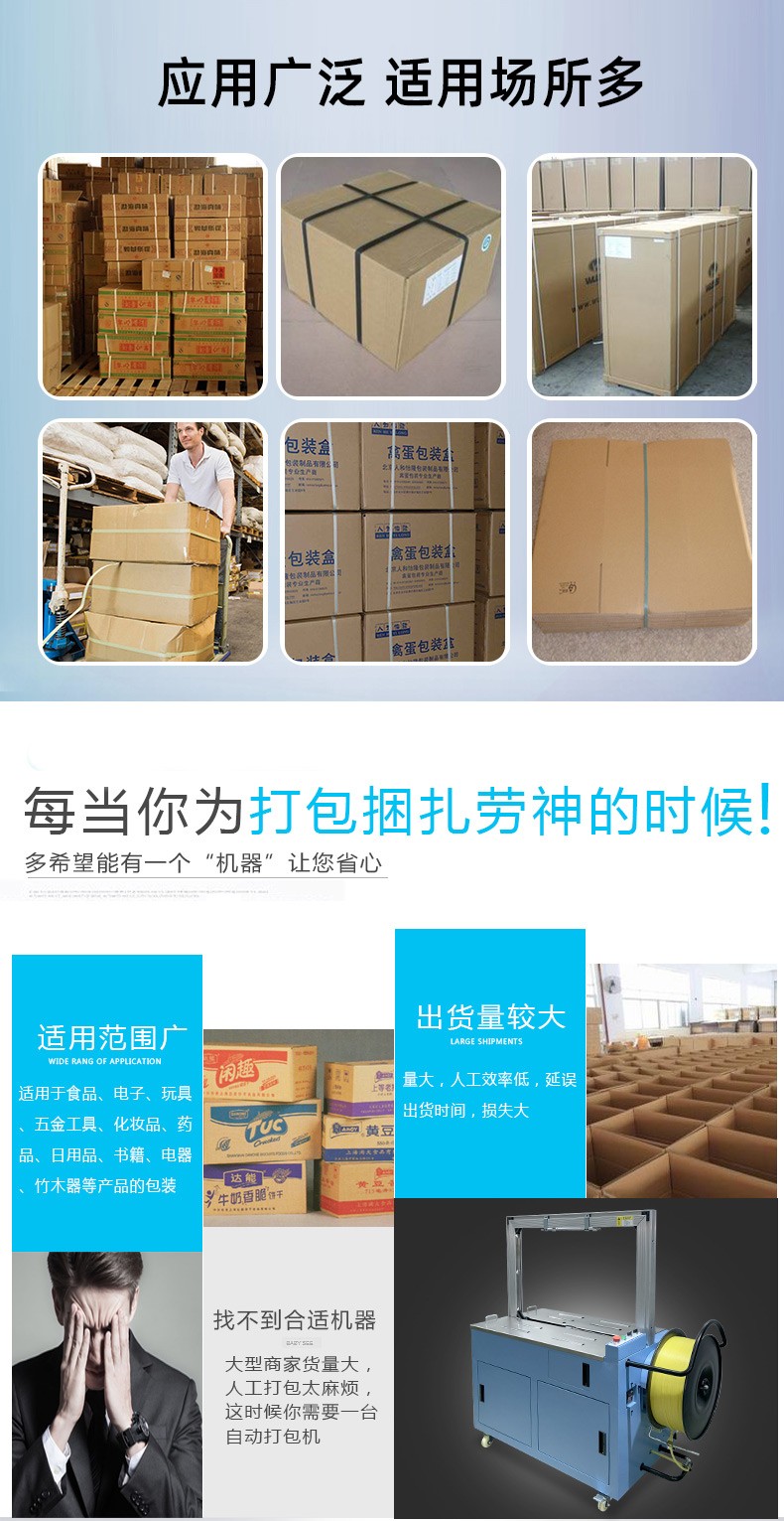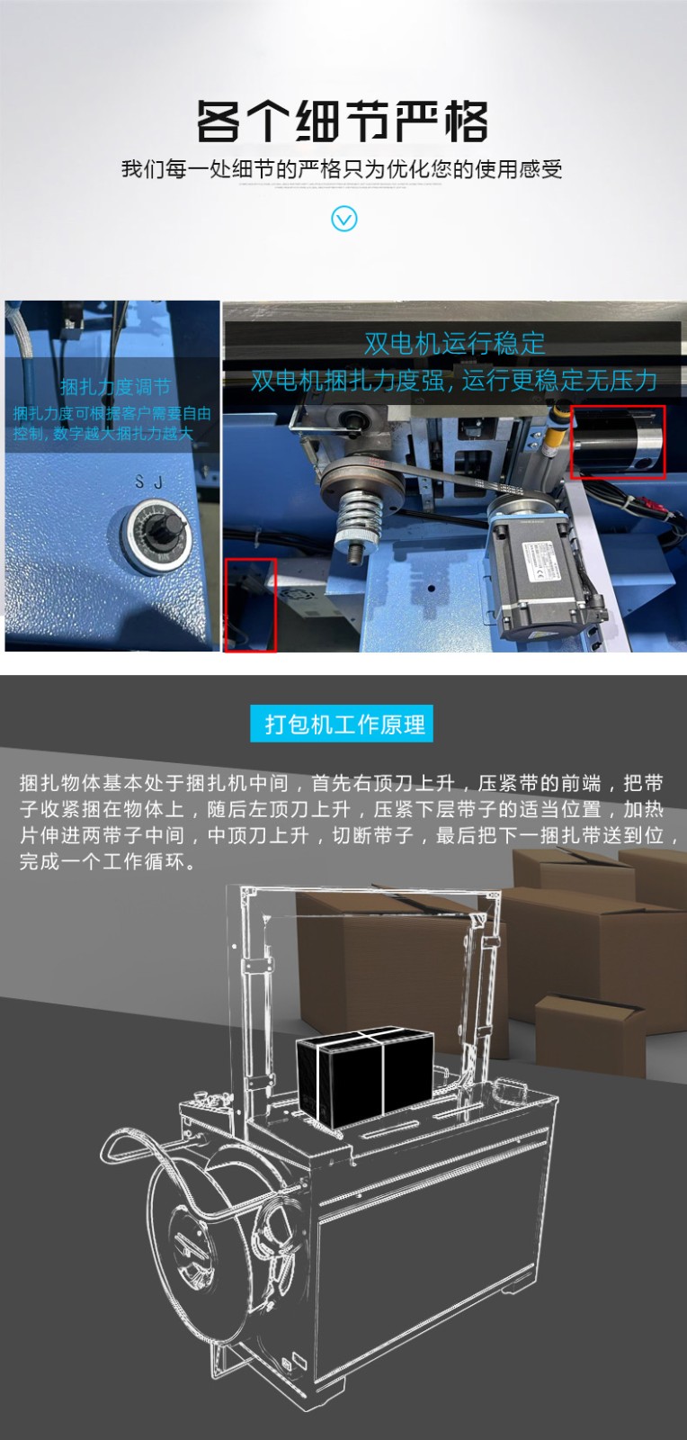 - 自動(dòng)上帶:機(jī)器啟動(dòng)后,會(huì)自動(dòng)從打包帶卷中抽出打包帶,并將其傳送到預(yù)定的位置,準(zhǔn)備進(jìn)行打包。這個(gè)過(guò)程無(wú)需人工干預(yù),大大提高了工作效率。