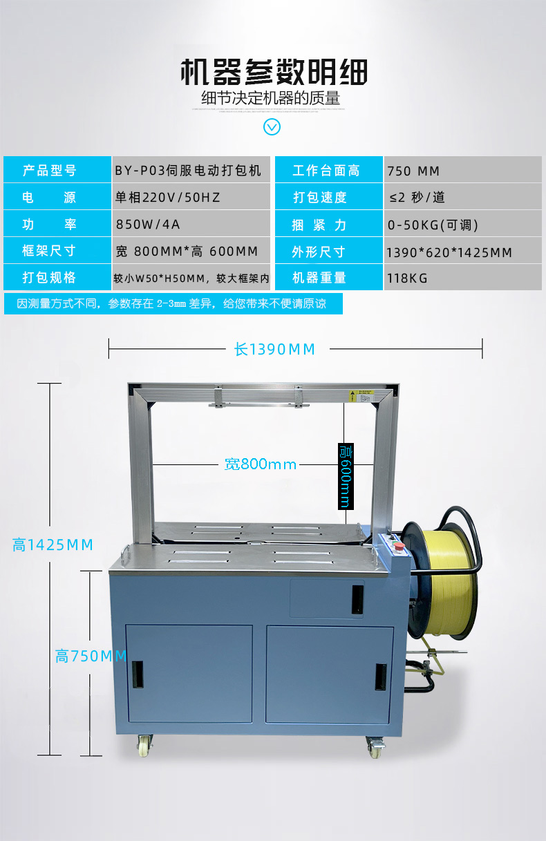 - 全自動(dòng)伺服打包機(jī)通常具有簡(jiǎn)潔、緊湊的外觀設(shè)計(jì),整體結(jié)構(gòu)堅(jiān)固耐用。其機(jī)身主要由框架、工作臺(tái)、輸送帶、控制箱等部分組成??蚣芤话悴捎脙?yōu)質(zhì)金屬材料制成,經(jīng)過(guò)精細(xì)加工和表面處理,具有良好的穩(wěn)定性和耐腐蝕性。工作臺(tái)位于機(jī)器的中央位置,是放置待打包物品的區(qū)域,表面平整光滑,便于物品的放置和移動(dòng)。輸送帶貫穿整個(gè)機(jī)器,用于輸送物品進(jìn)出打包區(qū)域,其寬度和長(zhǎng)度根據(jù)不同的機(jī)型有所差異,以適應(yīng)各種尺寸的物品打包??刂葡渫ǔ0惭b在機(jī)器的一側(cè),集成了操作面板和控制系統(tǒng),方便操作人員進(jìn)行參數(shù)設(shè)置和對(duì)機(jī)器的運(yùn)行進(jìn)行監(jiān)控。