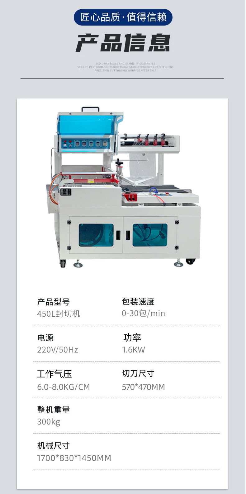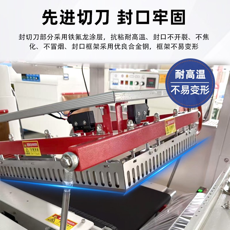- L 型封切刀(由橫向刀和縱向刀組成,呈 “L” 形)快速下壓,同時通過 “熱封 + 切斷” 一體化動作:先通過加熱條將膜的重疊處熱封(形成密封的 “膜袋” 套住產(chǎn)品),再通過內(nèi)置切刀切斷多余膜料,完成 “套膜” 工序;