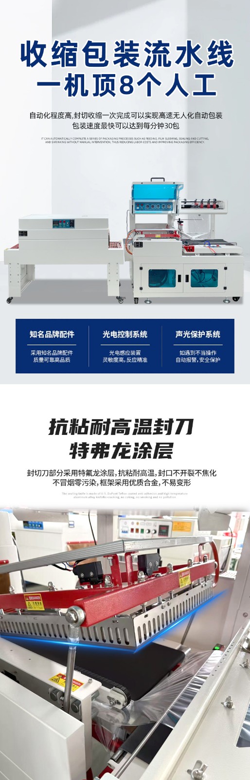 全自動 L 型封切熱收縮包裝機是一款集 “封切套膜” 與 “熱收縮定型” 于一體的自動化包裝設(shè)備,因封切機構(gòu)呈 “L” 形而得名,廣泛應(yīng)用于食品、醫(yī)藥、電子、日化等行業(yè),核心優(yōu)勢是包裝效率高、密封性好、外觀規(guī)整,能快速實現(xiàn)產(chǎn)品的單件或集合包裝,尤其適配規(guī)則形狀(如長方體、圓柱體)及中小型尺寸產(chǎn)品。下面從核心工作原理、關(guān)鍵結(jié)構(gòu)組成、核心優(yōu)勢、適用場景、選型與操作注意事項五個維度,全面介紹該設(shè)備: