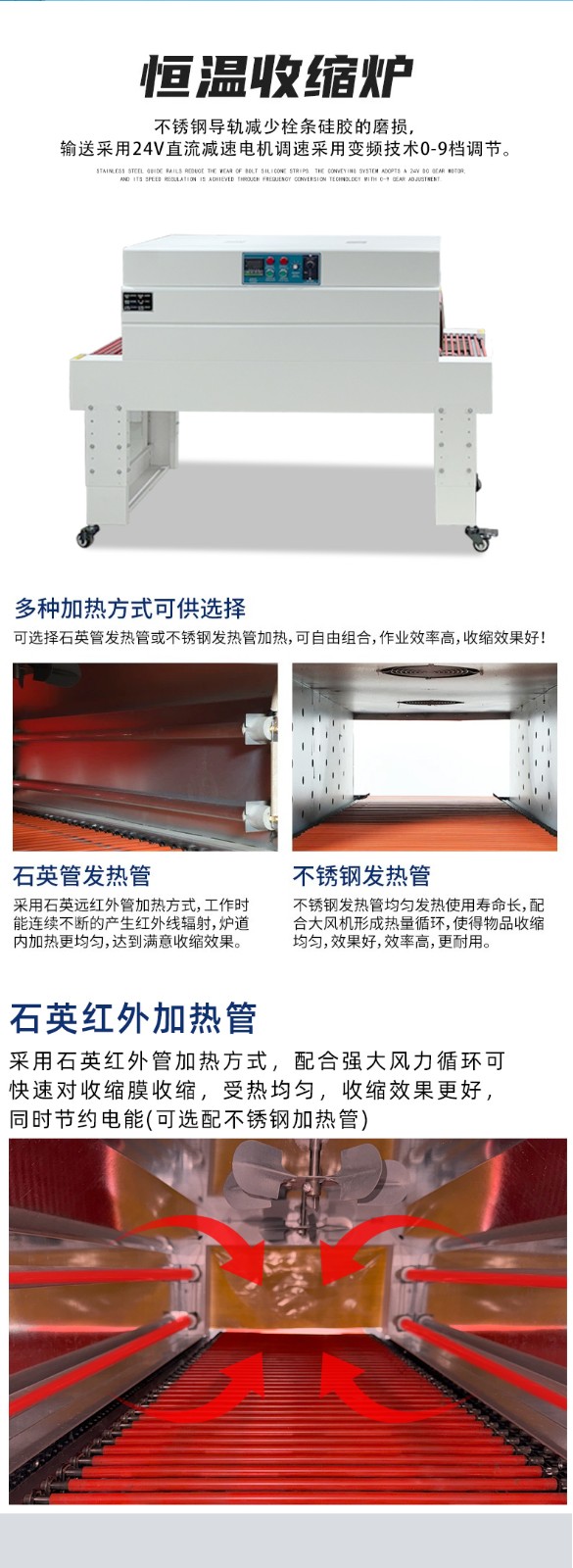 - 收縮爐采用 “不銹鋼保溫爐體 + 熱風循環(huán)設(shè)計”,熱量流失少,比傳統(tǒng)開放式加熱節(jié)能 20%-30%;