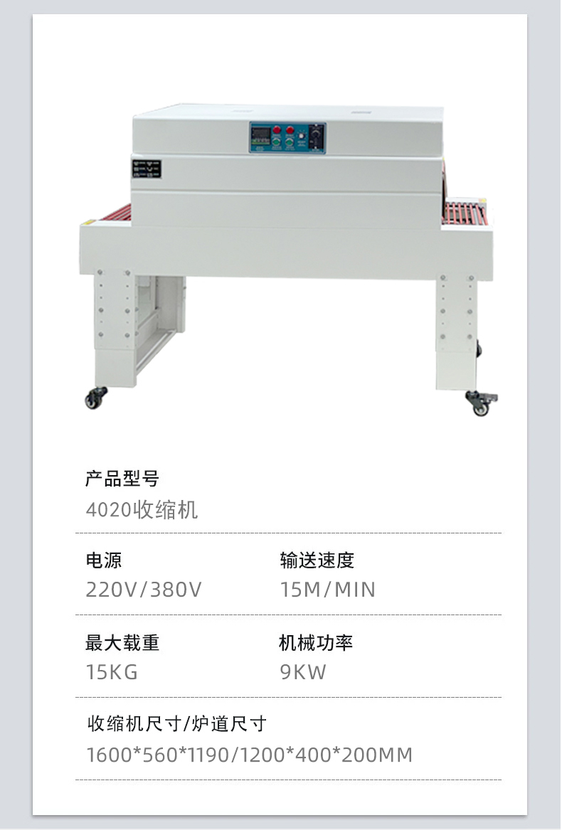 - 設(shè)備可通過調(diào)節(jié) “輸送帶速度、封切溫度、收縮溫度”,適配不同尺寸產(chǎn)品(通常適用產(chǎn)品尺寸:長 50-600mm、寬 30-400mm、高 20-300mm),從小件(如口紅、藥盒)到中件(如禮盒、小家電)均可包裝。
